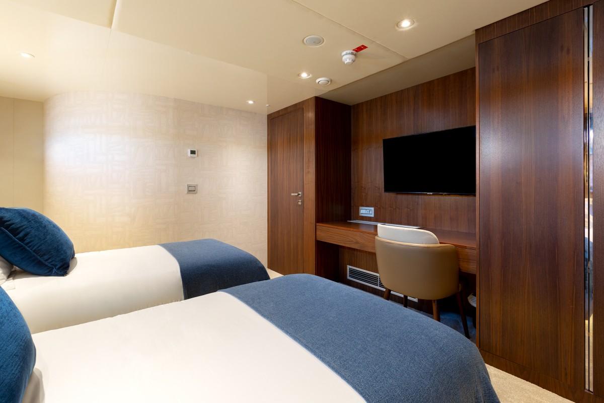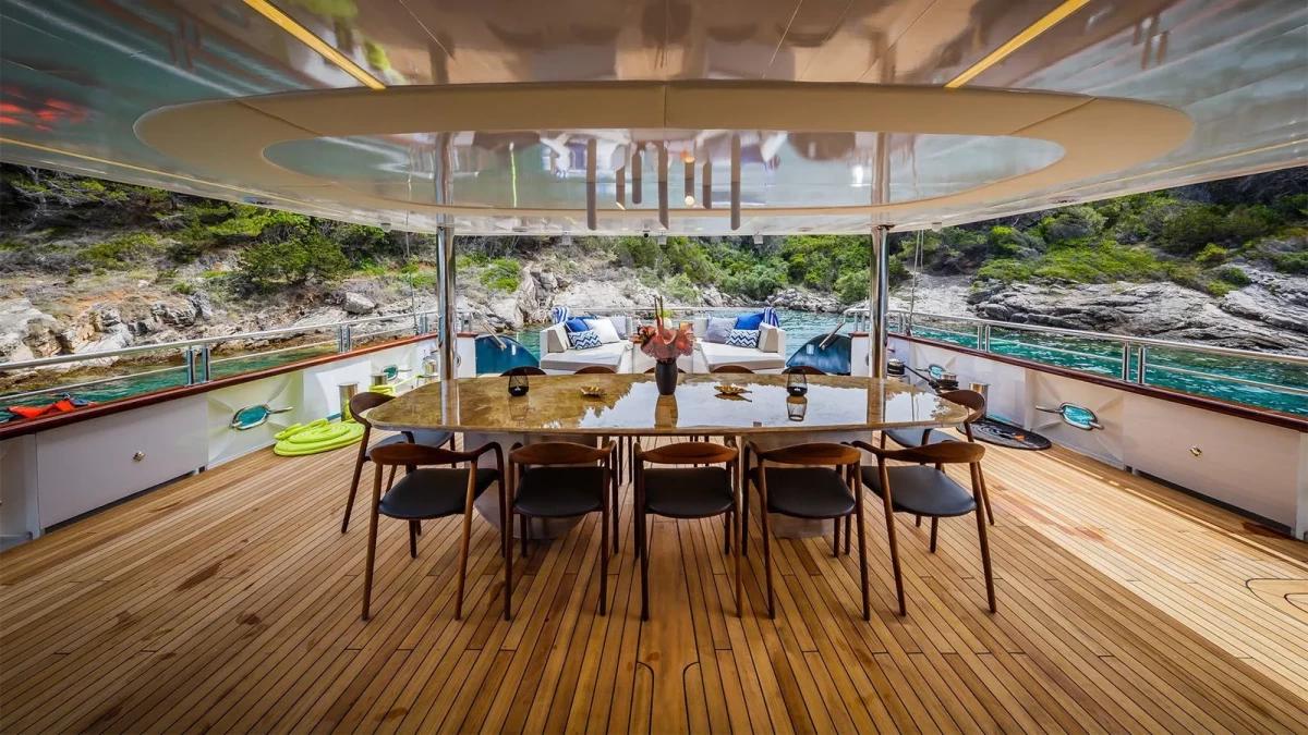 AMENITIES: Jacuzzi, Fire pit, Film screen with projector, Wet bar, Sunpads, Day head, Satellite TV in salon and cabins, Personal safe in each cabin, Toiletries, Bathrobes and slippers in each cabin, Wi-Fi.